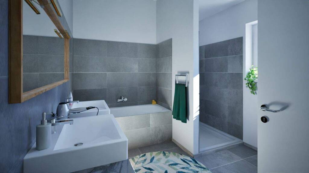 Das Dachgeschoss überzeugt mit drei zentral begehbaren Schlafzimmern, darunter das Hauptschlafzimmer mit eigenem Schrankraum. Das großzügige Badezimmer ist mit einer Badewanne, zwei Waschbecken, Dusche und WC ausgestattet. Ein weiterer Abstellraum rundet das Angebot ab.