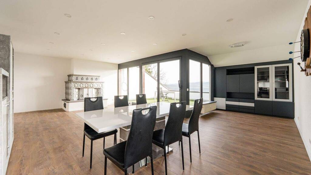 Im Erdgeschoss befinden sich neben dem Wohn- und Essbereich außerdem ein Abstellraum, ein Gästezimmer bzw. Homeoffice sowie ein Gäste-WC (inkl. Dusche). Der Grundriss wurde vom Eigentümer bereits angepasst, sodass der Wohn- und Essbereich heute offen gestaltet ist. Zusätzlich befindet sich im Wohnzimmer ein großer Kachelofen, der in den Wintermonaten für eine angenehme Wärme sorgen kann.