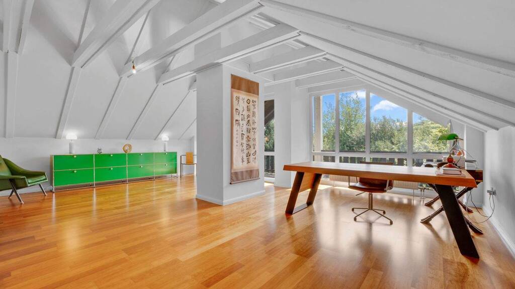 Der offen gestaltete Wohnbereich im Erdgeschoss begeistert mit edlem Fliesenboden, ca. 2,55m Deckenhöhe und einem stilvollen Raumkonzept. Eine elegante Glasschiebetür führt zur hochwertigen Einbauküche mit neuen Markengeräten, die im Kaufpreis enthalten ist. Das angrenzende Esszimmer mit 26,89m² und großflächigen Fenstern bietet Zugang zu beiden Terrassen. Über zwei Treppenstufen erreicht man das gemütliche Wohnzimmer mit offenem Kamin. Die großzügige Diele mit maßgefertigtem Einbauschrank und das Gäste-WC vervollständigen das Erdgeschoss. Im Obergeschoss befinden sich ein hochwertig saniertes Badezimmer mit bodengleicher Regendusche, ein Schlafzimmer mit Einbauschrank und eine beeindruckende Galerie mit 47,11m², Parkettboden, offener Sichtbalkendecke und Zugang zum 17,22m² großen Süd-Balkon. Der vollwertig ausgebaute Wohnkeller bietet ein weiteres Schlafzimmer mit Parkettboden, ein modernes Badezimmer mit Tageslicht sowie ein Heiz- und Abstellraum. Auch die Treppen wurden liebevoll aufbereitet und hochwertig gefliest.