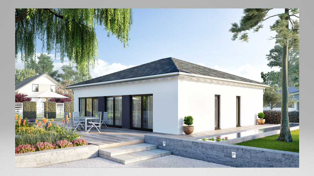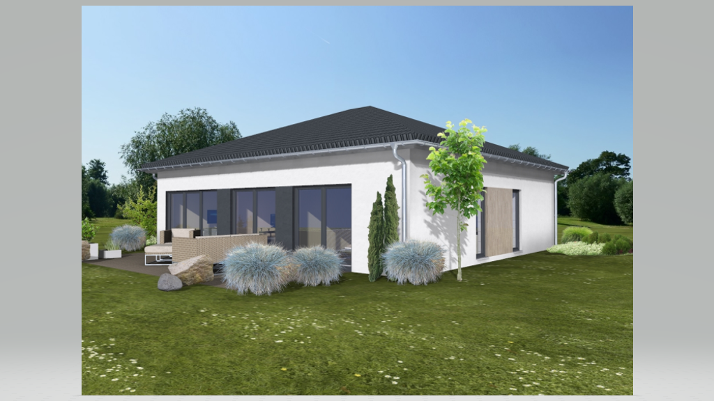 ...wo andere Urlaub machen... Der Bebauungsplan ermöglicht uns die Bebauung mit einem Bungalow oder auch ein Satteldachhaus über 2 Etagen nach Ihren Wünschen. Sie entscheiden über Haustyp, die Raum -Aufteilung und die Innenausstattung. Unser Angebot hier: KOMFORTABEL LEBEN AUF EINER EBENE Der Bungalow Rivano überzeugt durch klare Raumtrennung der einzelnen Bereiche. Doch durch geschickte Wandsetzung sind Küche und Wohnzimmer doch offen miteinander verbunden. Für Komfort sorgt ein großzügiges Schlafzimmer mit eigenem Ankleidezimmer. Neben dem Hauptbad mit bodengleicher Dusche steht ein zusätzliches Gästebad zur Verfügung. Ein flexibel nutzbares Gästezimmer, lässt sich idealer Weise auch als Büro oder Hobbyraum gestalten. Viele Fenster und Türen auf allen vier Seiten, lassen sämtliche Bereiche im Tageslicht erstrahlen. Farbige Elemente durchbrechen die klare Flächenstruktur und verschaffen dem Haus eine individuelle Leichtigkeit. Alles zusammen ergibt ein perfektes Konzept für Wohnen auf einer Ebene, das sich auch ideal für das Wohnen im Zweiten Leben eignet. Der dargestellte Bungalow ist eine Basis-Version, bei der Sie selbst u./ o. zusammen mit Familie & Freunden handanlegen können, um die einzelnen Ausbaustufen in individueller Qualität zu realisieren oder einzelne/alle Leistungen in Büdenbender Qualität zu bestellen.