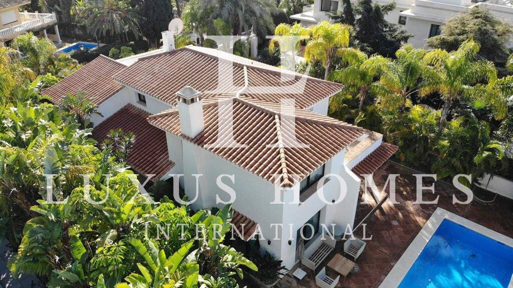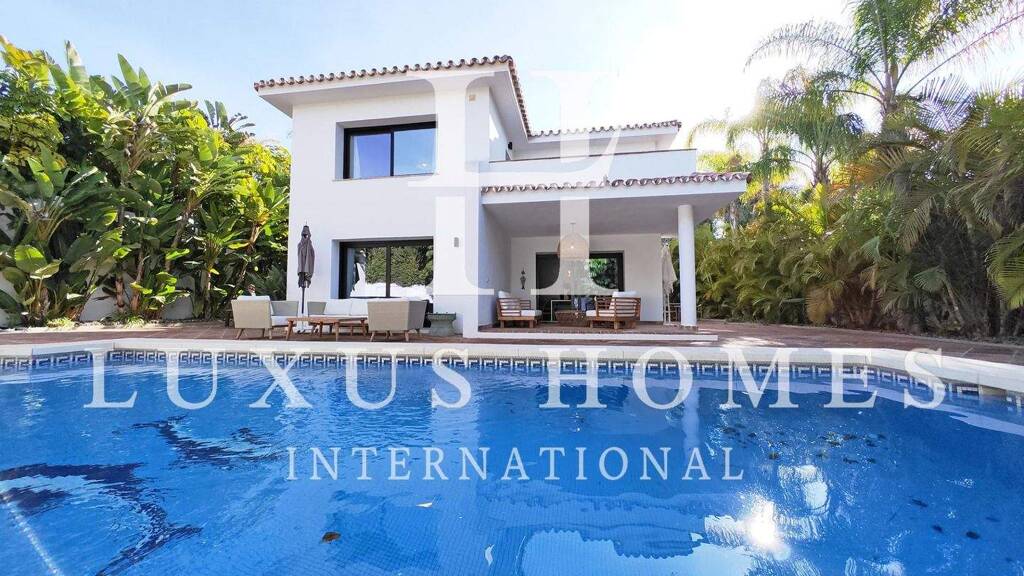 Diese exquisit gestaltete Luxusvilla zum Verkauf in Marbella verbindet harmonisch Raffinesse, atemberaubende Aussicht und Zugang zu gehobenen Annehmlichkeiten. Nur einen Spaziergang von der sonnenverwöhnten Küste entfernt im prestigeträchtigen Wohnviertel Los Monteros gelegen, bietet diese opulente Villa mit 4 Schlafzimmern einen Lebensstil, der von Luxus und Komfort geprägt ist. Das Erdgeschoss der Villa verfügt über einen geräumigen Wohn- und Essbereich mit Kamin, eine helle separate Küche mit Stauraum, ein Gäste-WC und Zugang zur Außenterrasse und zum Pool. Zwei großzügig geschnittene Schlafzimmer, die sich beide ein gestaltetes Badezimmer teilen, befinden sich im ersten Stock der Villa, mit einem zusätzlichen Schlafzimmer mit Bad und der atemberaubenden Master-Suite mit begehbarem Kleiderschrank und einem Balkon mit herrlicher Aussicht, der sich im zweiten Stock befindet. Eine Dachterrasse bietet einen Panoramablick auf das Meer und die Berge und schafft den perfekten Rahmen für Momente der Ruhe und Kontemplation. Ein Swimmingpool und sorgfältig angelegte Gärten bieten ein idyllisches Refugium, in dem sich die Bewohner entspannen, Versammlungen veranstalten oder einfach nur die natürliche Umgebung genießen können. Zu den weiteren luxuriösen Annehmlichkeiten gehören ein Weinkeller, Wäschemöglichkeiten und eine Sauna. Los Monteros ist eine exklusive Wohngegend von Marbella, die für ihre prestigeträchtigen Immobilien, Privatsphäre und erstklassigen Annehmlichkeiten bekannt ist.