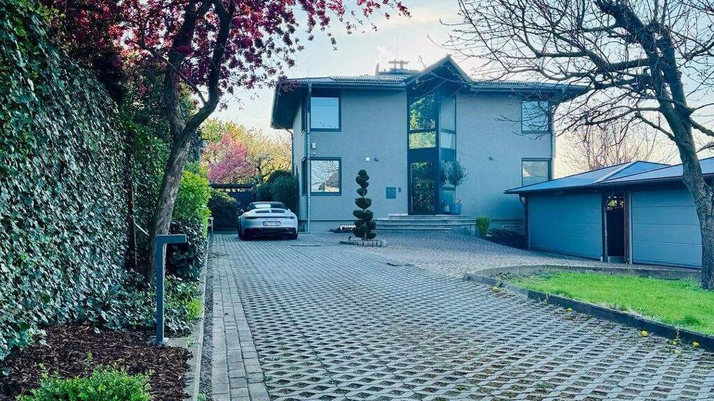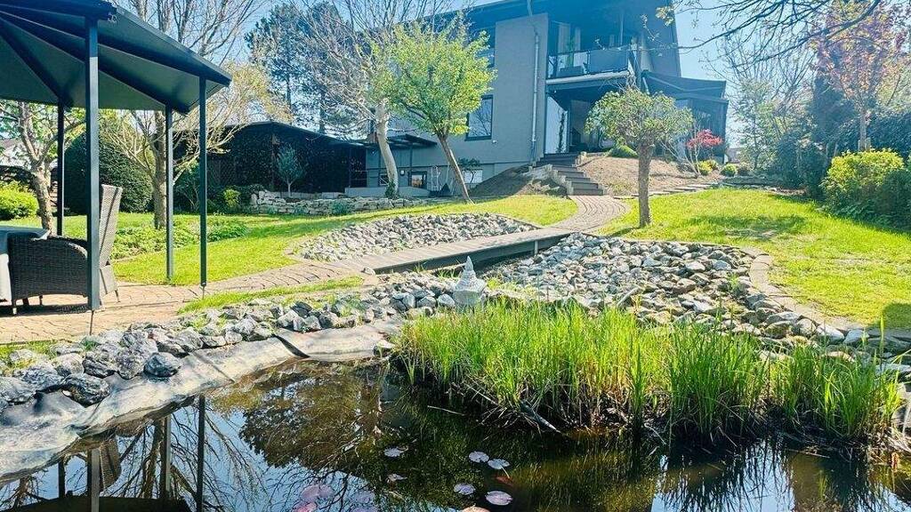 OBJEKTBESCHREIBUNG Das 1996 massiv errichtete Einfamilienhaus bietet etwa 210 m² Wohnfläche auf einem rund 940 m² großen, u¨ber ein privates Tor erreichbaren Grundstu¨ck. Zudem Angebot gehört ein. separates Baugrundstück mit nochmla knapp 800 m². Mittelpunkt ist das runde, von einer Glaspyramide belichtete Treppenhaus. Im Erdgeschoss liegen Arbeitszimmer, Gäste-WC sowie eine moderne Einbauku¨che mit Bosch-Geräten und angrenzendem Hauswirtschaftsraum; daran schließt der lichtdurchflutete Wohn- und Wintergartenbereich mit Design-Kamin an. Das Obergeschoss umfasst drei flexibel nutzbare Zimmer, zwei Balkone, ein separates WC und ein großzu¨giges Bad mit freistehender Wanne, Dusche und Fußbodenheizung. Ergänzt wird das Raumangebot durch einen Teilkeller mit Sauna und Dusche. Parkett im Erdgeschoss, Teppich im Obergeschoss, Aluminiumfenster mit Sicherheitsbeschlägen und Fußbodenheizung im Wohnzimmer unterstreichen den Komfort. Die Gasbrennwertheizung (2013) arbeitet mit Photovoltaik- und Solarthermieanlage. Der liebevoll angelegte Garten mit altem Baumbestand, Teich, Bru¨cke, Pavillon und neuer Terrasse aus italienischen Keramikplatten schafft eine idyllische Atmosphäre. Ein Doppelcarport mit Sektionaltor sowie weitere Stellplätze sind vorhanden; auf Wunsch können ein zusätzliches Carport und weiteres Land erworben werden. Zahlreiche Einbauschränke runden das hochwertige Gesamtpaket ab. KEINE MAKLERPROVISION!