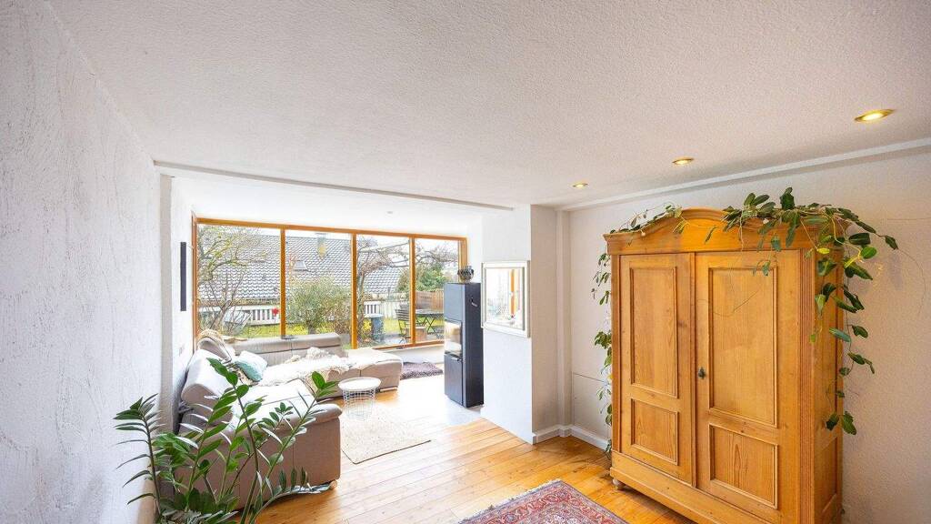 Rechterhand öffnet sich der Flur in das großzügige Wohnzimmer, das zweifellos das Herzstück dieser Ebene bildet. Ein gemütlicher Kamin sorgt hier besonders in den kühleren Monaten für eine warme und behagliche Atmosphäre. Die große Glasfront lässt viel Tageslicht in den Raum und schafft ein lichtdurchflutetes Ambiente, das beinahe an einen Wintergarten erinnert. Von hier aus schweift der Blick in den Garten, wodurch Innen- und Außenbereich harmonisch miteinander verbunden wirken.