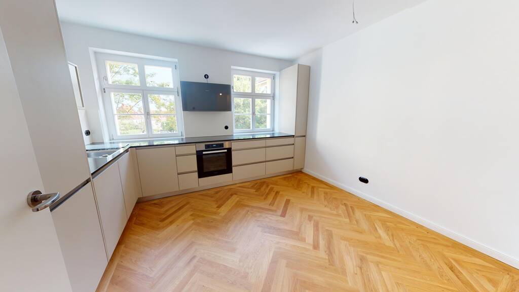 Hier erwarten Sie lichtdurchflutete Räume, feines Fischgrätenparkett, hochwertige Drehschalter und Steckdosen, sowie eine exklusive Einbauküche (alle Geräte sind von Miele).