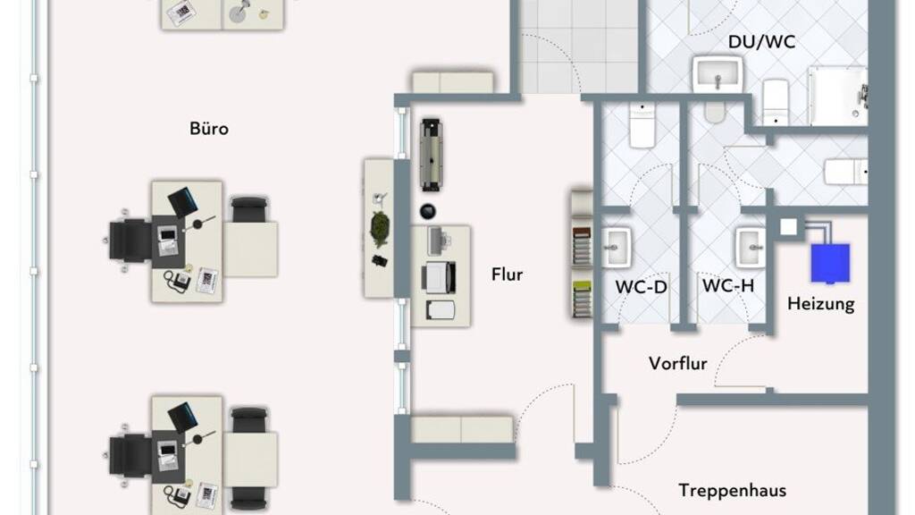 Das Bürogebäude erstreckt sich über 4 Geschosse und verfügt über ein zentrales Treppenhaus sowie getrennte Sanitäranlagen für Damen und Herren auf jeder Etage. Jede Etage bietet abgetrennte Büroflächen mit Größen von 115 m² bis 125 m², was auch eine Anmietung von einzelnen Etagen ermöglicht.