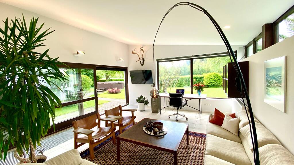Das Besondere der Wohnung ist die helle und offene Grundrissgestaltung mit hochwertiger Vintage Design-Einrichtung samt Blick auf Wald, Wiese und Berge. Die gesamte Wohnung wurde im Frühjahr 2022 liebevoll renoviert und ist ausgestattet mit einer hochqualitativen offenen Küche mit Esstisch, einem großzügigen Wohnbereich, einem Arbeitsplatz mit Waldblick, einem 24 m² großen Schlafzimmer.