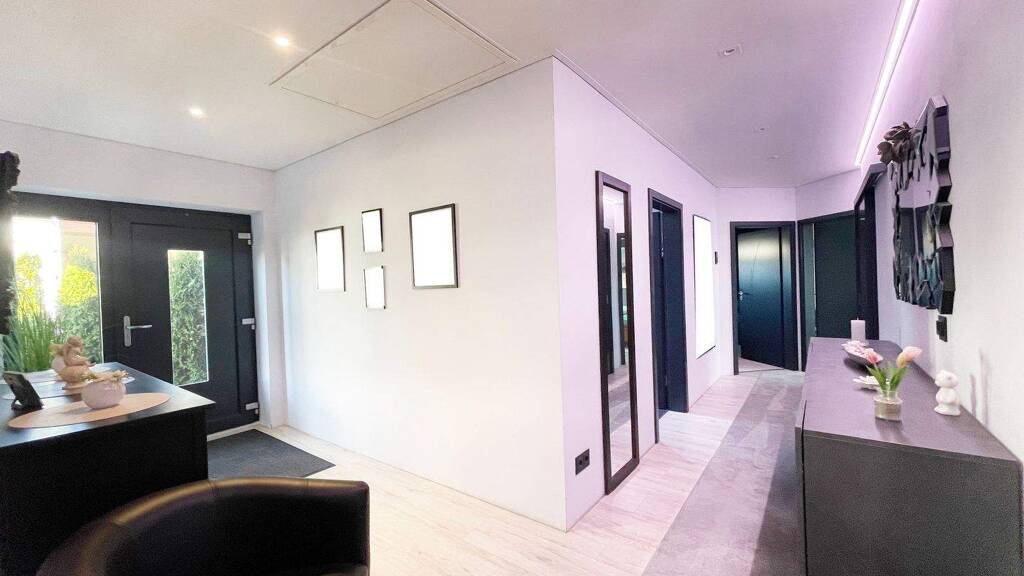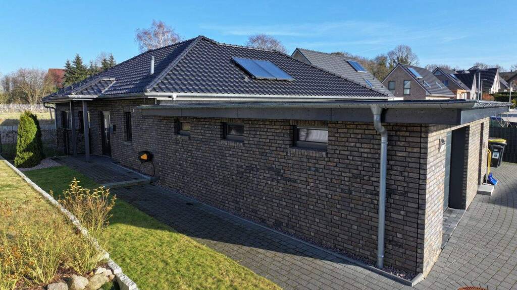 Dieser moderne Winkelbungalow in sehr. guter Lage wurde im Jahr 2020 in massiver Bauweise errichtet. Er befindet sich auf einem 713m2 großen, pflegeleicht angelegten Grundstück mit angrenzendem Grünstreifen. Insgesamt stehen Ihnen im Haus ca. 124m2 Wohnfläche mit absolutem Wohlfühlfaktor zur Verfügung. Alle Räume verfügen über eine Fussbodenheizung, Spanndecke und Ambientebeleuchtung (professionelle KNX Smart Home Technik). (mehr im Exposé) Diese solide Immobilie mit Klinkerfassade bietet 1 großzügig gestalteten Wohn-/ Essbereich mit offener Küche, 2 Schlafzimmer, 1 Büro / Ankleideraum (ca. 7m2), 1 Bad mit Badewanne und ebenerdiger Dusche in größerer Dimension, 1 Gästebad, 1 Hauswirtschafts- / Heizungs-/ Technik-Raum, einer großen und einer kleineren Terrasse und eine gut dimensionierten Garage samt Werkstattbereich (beheizbar). (mehr im Exposé) Der Hauswirtschaftsraum mit Nebeneingangstür bietet Platz für weitere Haustechnik, wie ein extra großer Kühlschrank, Waschmaschine und Trockner, sowie andere größere Haushaltsgeräte. Die angebaute Garage wirkt mit ihren 62m2 wirklich großzügig. Hier kann ``Mann`` sich verwirklichen. Ob Auto, Motorrad, Rasentraktor, Werkstatt usw. Alles hat hier seinen Platz. Die Garage kann über die Zentralheizung beheizt werden. Wissenswertes: Der gesamte Dachboden ist ausbaufähig! Der rückwärtige Garten ist umzäunt. Das Dach bietet eine ausreichende Fläche, um eine gut dimensionierte PV-Anlage zu installieren. Der rückwärtig gelegene Garten grenzt an einen Grünstreifen. Der Winkelbungalow verfügt über 2 Terrassen. Eine wurde südöstlich und eine südwestlich aus- gerichtet. Die Nachbarschaft besteht aus netten Menschen diversen Alters und wirkt an allen Ecken sehr freundlich.