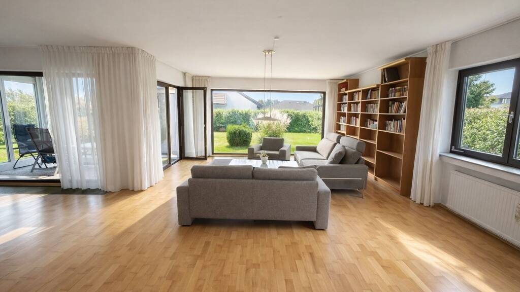 Das Herzstück des Hauses ist das beeindruckende ca. 60 m² große Wohn- und Esszimmer, das durch seine Größe und Helligkeit ein außergewöhnlich großzügiges Raumgefühl vermittelt. Von hier aus gelangen Sie direkt in den Wintergarten, der einen schönen Blick in den Garten ermöglicht und zusätzlichen Wohnraum für entspannte Stunden bietet.