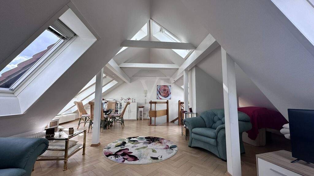 Das offen gestaltete Dachgeschoss beeindruckt durch elektrisch zu öffnende First-Fenster, Dachflächenfenster der Marke VELUX und Sichtbalken aus weiß beschichtetem Holz. Hier können zusätzliche Wohn- oder Arbeitsbereiche realisiert werden.