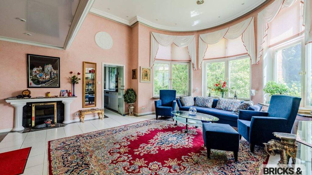 Der großzügige Wohnbereich überzeugt mit einer beeindruckenden Deckenhöhe von bis zu 3,65 m, einem charaktervollen Erker, Kamin sowie großen Fensterflächen mit Blick ins Grüne.