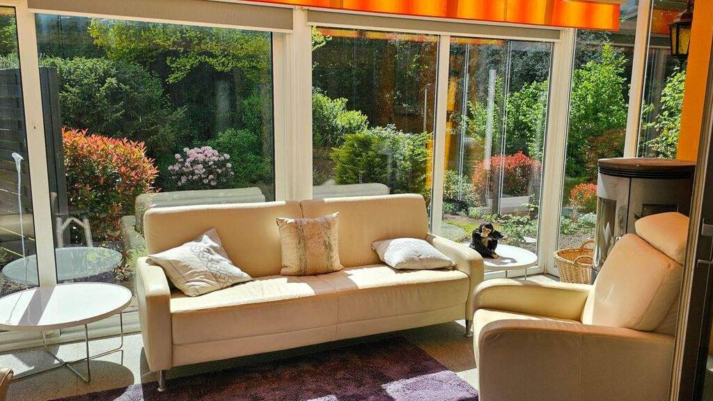 Eine bequeme Sitzecke mit Kaminofen im lichtdurchfluteten Wintergarten (mit Sonnenmarkise) unterstreicht die Gemütlichkeit des Hauses.