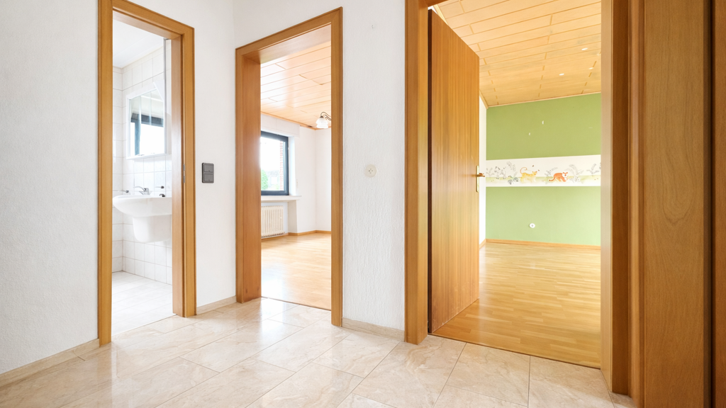 Ein besonderes Highlight der Immobilie ist der auf dieser Ebene separat gelegene Bereich im Obergeschoss. Hier befindet sich ein Schlafzimmer mit eigenem Tageslichtbad en suite. Der Zugang erfolgt über den Hauptflur, der zugleich zur derzeit vermieteten Dachgeschosswohnung führt. Aufgrund seiner abgeschlossenen Lage sowie der vorhandenen Badanbindung verfügt dieser Bereich über einen nahezu eigenständigen Charakter und bietet sich ideal als privater Rückzugsort für ältere Kinder oder Jugendliche an, die innerhalb des Hauses einen unabhängigen Wohnbereich nutzen möchten. Darüber hinaus besteht die attraktive Möglichkeit, diesen Bereich zu einem kleinen Apartment auszubauen und extern zu vermieten, wodurch zusätzliches Einnahmepotenzial erschlossen werden kann.
