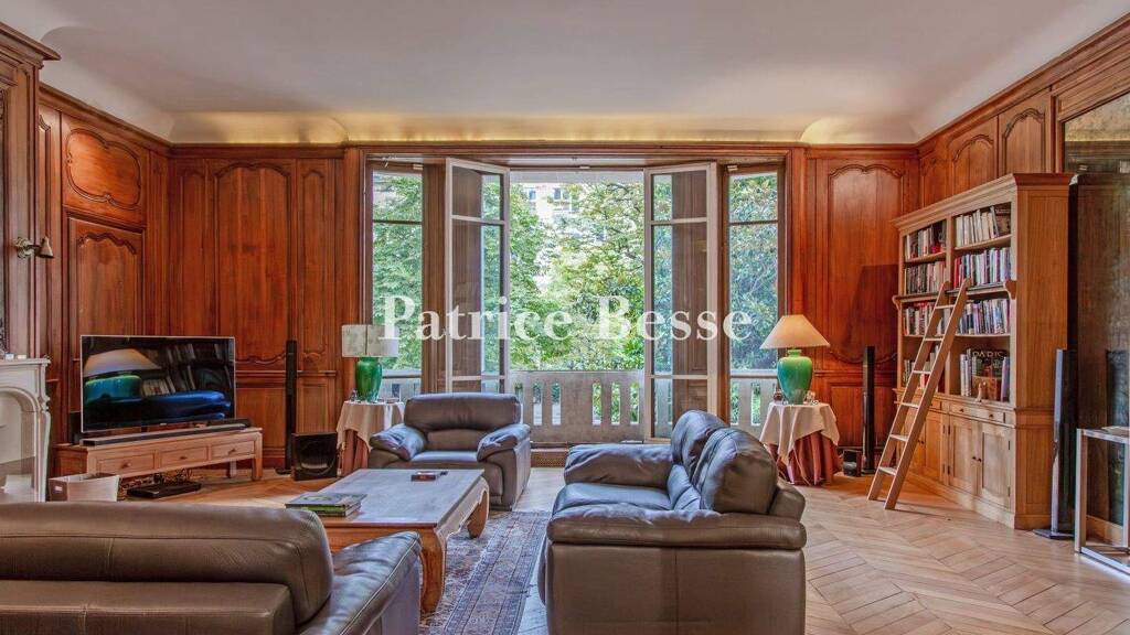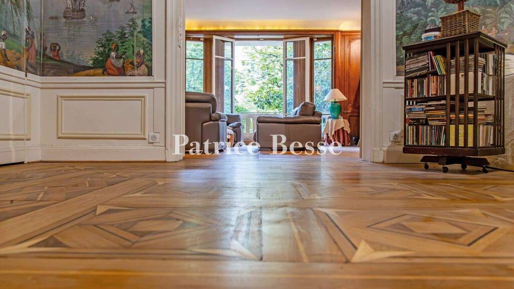 Located on the south side of the avenue, sixty metres wide, the property is from the Art Deco period and boasts an ashlar façade adorned with sculptures, mascarons and balustrades. Entrance to the premises is via an ironwork gate with a secure code. Two sculpted columns frame the double-leaf glazed entrance door protected by finely crafted ironwork. There is also an entry code system and intercom. Furthermore, a building superintendent looks after the perfectly maintained communal areas in the condominium.A staircase and elevator lead to the upper floors. A second elevator can also be found next to the building's service staircase. The apartment is situated on the first floor and boasts uninterrupted views. It is made up of a large entrance hall with wood flooring featuring elaborate inlaid geometric patterns, a lounge, a dining room, two bedrooms (with the possibility of creating a third), two bathrooms and a kitchen. The total surface of the reception rooms is 100 m², while the ceiling height is 3.30 metres. The decoration is sophisticated, made up of inlaid or chevron patterned wood flooring, fireplaces and wood panelling. This dual aspect apartment with impressive volumes is bathed in light, facing south and north / northwest.Lastly, there is also a cellar. It is also possible to purchase a 25-m² parking space in the same building. The apartment The vast staircase, covered with a red carpet and graced with a finely crafted wrought iron balustrade, as well as the elevator, which also has a wrought iron door, are of the purest Art Deco style and both lead to the apartment. The imposing, double-leaf, solid wood door opens into the apartment's very spacious entrance hall. The tone is set by the colourful and panoramic décor of the wallpaper inspired by Zuber's "Views of Brazil", as well magnificent inlaid wood flooring.The reception rooms can be found on either side of the entrance hall. The walls are covered with painted and moulded wood panelling, while there is chevron patterned wood flooring. A fireplace with a sculpted white stone mantelpiece completes the luxurious décor, dominated by the warm colours of the wood. This south-facing room is bathed in light thanks to the two double windows with stone balustrades that act as guard-rails. Opposite, on the side of the tree-lined courtyard, light streams into the dining room with cream-coloured wood panelling through a semi-circular window. There is also chevron-patterned wooden flooring in this room, whose sophistication is further enhanced by a fireplace with a grey-veined sculpted white mantelpiece topped by a trumeau mirror that reflects the light.A corridor leads to a large bedroom and an adjacent bathroom. Nearby, there is a guests' lavatory. The tiled, fully fitted and open-plan kitchen possesses a service door. Lastly, a door leads to a second corridor, which in turn leads to the second bedroom and adjacent bathroom with a lavatory.