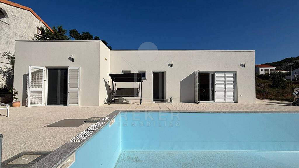 Die Terrasse ist das Herzstück: Weitläufig, gefliest und komplett zum Meer hin geöffnet. Hier spielt sich das Leben draußen ab - auf Wunsch im Schatten, auf der Liege oder direkt am Wasser. Der beheizte Pool misst 10 × 5 Meter, hat 1,5 Meter Tiefe und ist ein echtes Highlight: LED-Beleuchtung in 25 Farben, Wärmepumpe und viel Platz zum Schwimmen. Wer gerne gärtnert, wird sich über das gemauerte Hochbeet entlang der Rückseite freuen - bewässert mit Regenwasser aus der unterirdischen Zisterne.