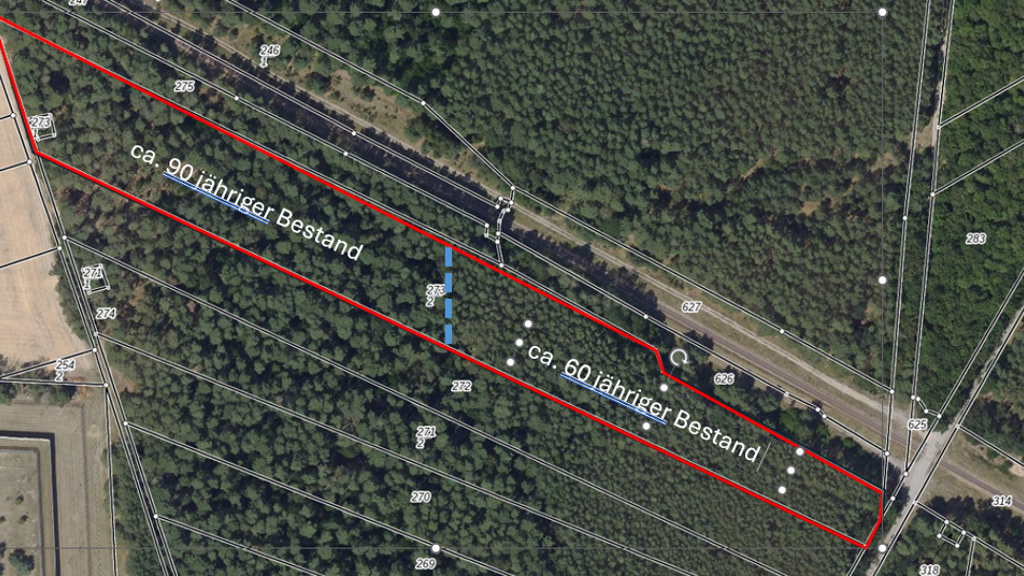 1 ha Kiefern, ca. 60 Jahre alt, sehr wüchsig (1.0 bestockt)