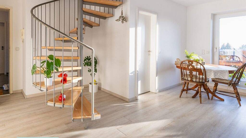 Über eine elegante Wendeltreppe erreichen Sie die obere Etage. Hier steht Ihnen ein weiterer, großzügiger Raum mit viel Tageslicht zur Verfügung, der sich flexibel als zweites Schlafzimmer, Arbeits- oder Gästezimmer nutzen lässt. Ergänzt wird diese Ebene durch ein weiteres Badezimmer mit Dusche.