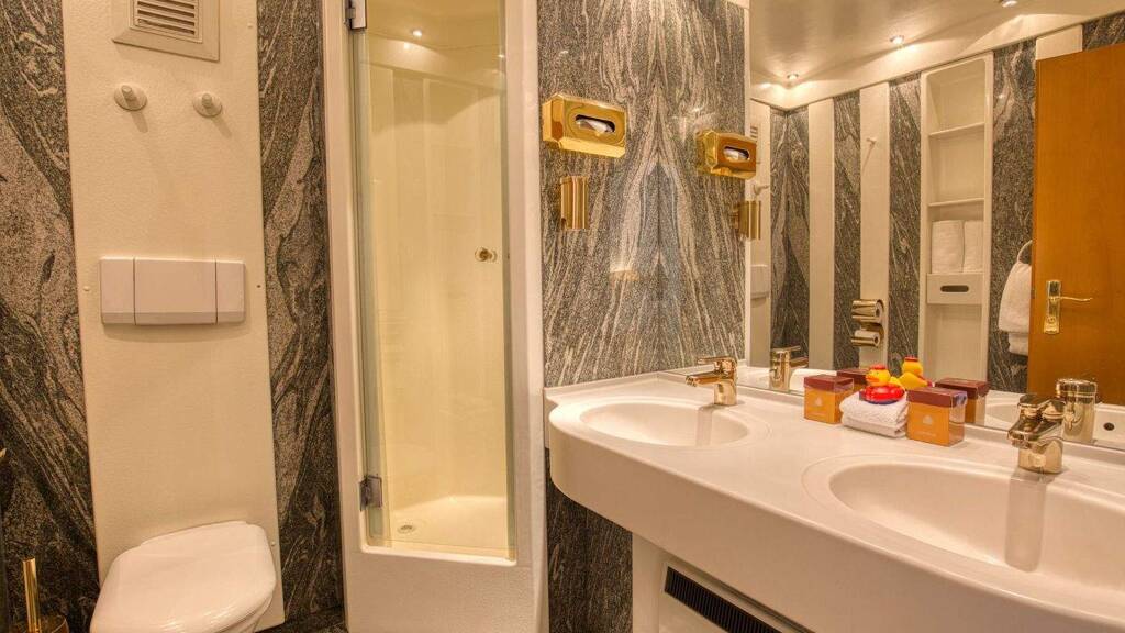 Zur Ausstattung gehören: Waschbecken mit großer Ablagefläche- Dusche mit Glastrennwand. Spiegel und Kosmetikspiegel. Handtuchheizkörper und WC. Pflegeleichte, stilvolle Materialien.