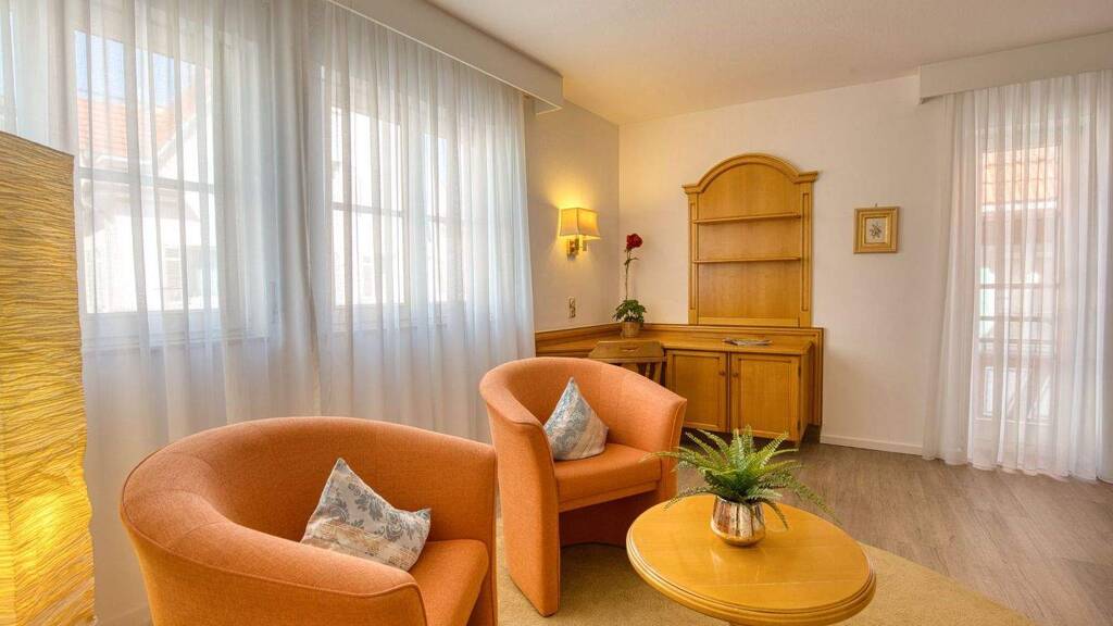 Die geschmackvolle Einrichtung mit Ledersesseln, Flachbild-TV, stilvoller Beleuchtung und dekorativen Akzenten schafft ein Zuhause mit Wohlfühlcharakter - perfekt für längere Aufenthalte.