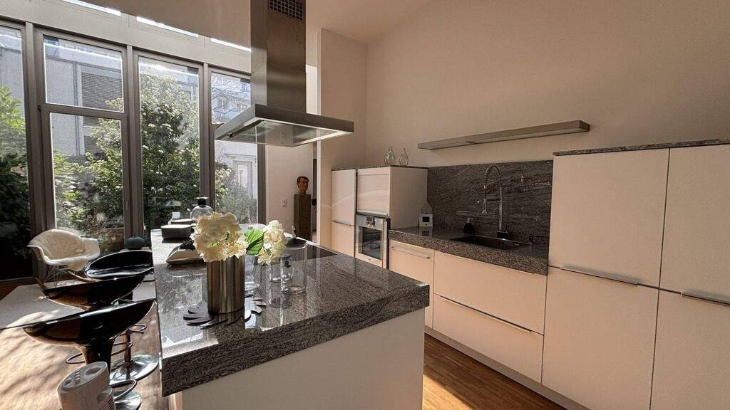 - Voll Möbliert - Loft Wohnung mit ca. 132 m² Wohnfläche und 2 Zimmern - Wohnbereich mit großformatigen Fensterflächen und bodentiefen Fensterelementen - Wohnbereich mit integrierten Einbauten als Regalwand - Küche als offene Einbauküche mit Kochinsel - Arbeitsplatte und Nischenverkleidung in Steinoptik - Einbaugeräte mit Backofen auf Arbeitshöhe - Spüle mit Einhebelmischer und Abtropffläche - Wintergarten mit Glasdachkonstruktion - Schlafzimmer mit bodentiefem Fensterelement und Zugang zur Terrasse - Badezimmer mit Badewanne und separater Dusche mit Glasabtrennung - Gäste-WC - Eingangsbereich mit Gegensprechanlage - Beleuchtung mit Deckenaufbauleuchten in mehreren Bereichen - Terrasse mit direktem Zugang aus dem Wohnbereich - 2 TG-Stellplätze im Mietpreis inkludiert