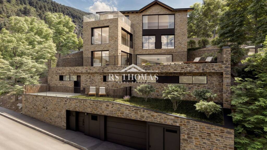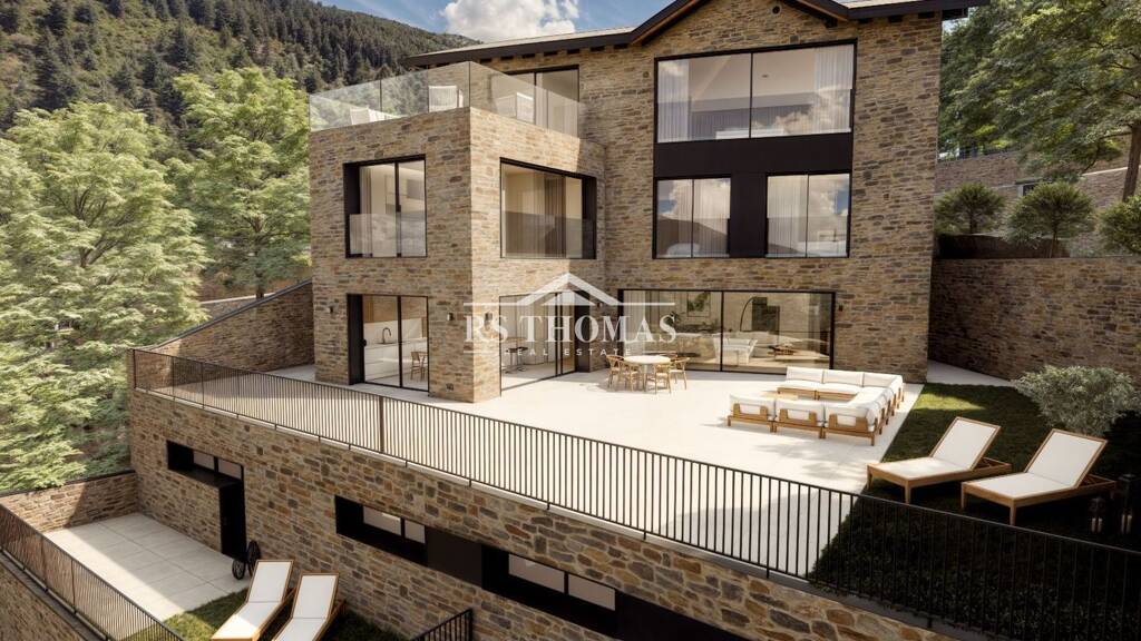 Spektakuläre neugebaute freistehende Villa von 1.145 m² mit 344 m² Terrassen und Garten, gelegen im renommierten Viertel Les Cortals d'Encamp, nur 10 Minuten vom Zentrum Andorras und 2 Minuten vom Funicamp entfernt, das Zugang zum größten Skigebiet Südeuropas bietet. Es zeichnet sich durch seine tagsüber sonnige Ausrichtung, seine beeindruckenden Panoramablicke und seine Verteilung auf fünf große und funktionale Stockwerke aus: Kellergeschoss -2 (437,58 m²): zwei Lagerräume, zwei technische Räume für aerothermische Energie und Hausautomation, Flur/Verteiler und Garage mit Kapazität für 11 Fahrzeuge. Kellergeschoss -1 (362,08 m²): zwei Suiten, Gästebad, zwei Mehrzweckräume, Fitnessraum und Waschraum. Terrasse und Garten von 75,50 m². Erdgeschoss (123,11 m²): geräumiges Wohnzimmer mit offener Küche und Toilette. Terrasse und Garten mit 236,99 m². Erdgeschoss (125,64 m²): Flur, zwei Suiten, ein zusätzliches Schlafzimmer und ein Badezimmer. Zweites Obergeschoss unter Deck (96,35 m²): Flur, eine Master-Suite mit Bad, Umkleideraum und Zugang zu einer Terrasse von 31,70 m². Diese prächtige Villa bietet große Flächen, hochwertige Oberflächen und ist mit den neuesten Technologien ausgestattet: Hausautomationssystem, aerothermische Energie, Klimaanlage, Fußbodenheizung und Aufzug. Leben Sie in einer idyllischen Umgebung, umgeben von Natur, nur wenige Minuten vom Zentrum Andorras entfernt, mit all dem Luxus und Komfort, den Sie verdienen.