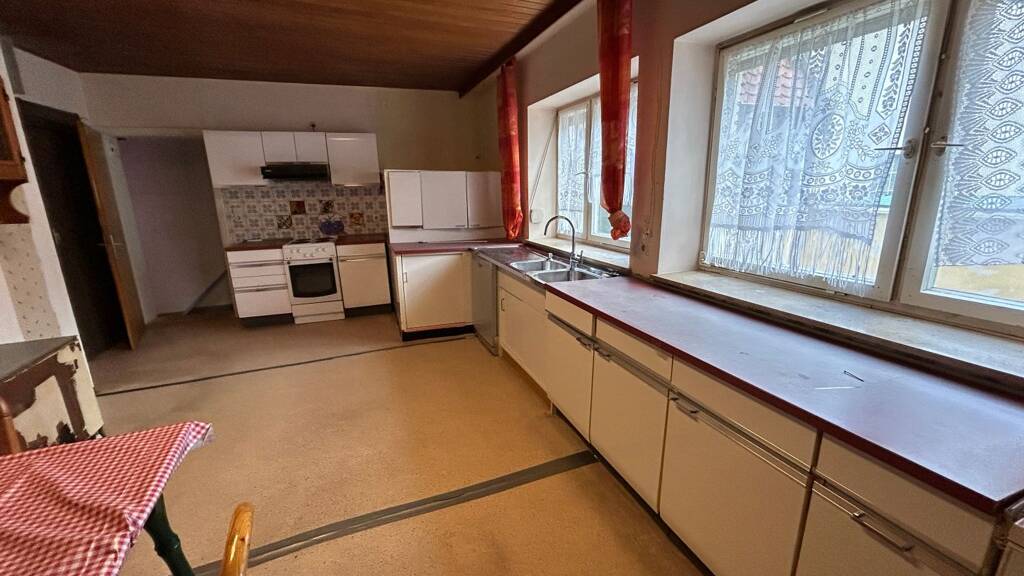 Von der großen Terrasse der ersten Wohneinheit führt der Weg direkt in den neueren Gebäudeteil, wo sich eine zweite Wohneinheit befindet. Diese verfügt über ein geräumiges Zimmer, ein separates Badezimmer mit WC, zwei weitere Zimmer sowie eine eigene Küche.