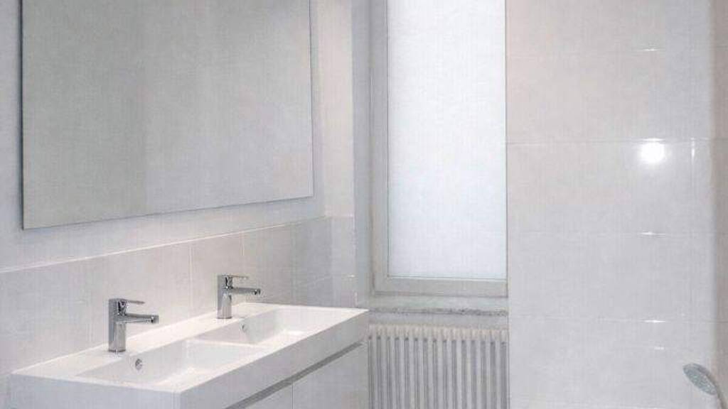 Das Bad verfügt über ein Fenster und ist mit einer Badewanne, zwei Waschbecken sowie einem Waschmaschinenanschluss ausgestattet.