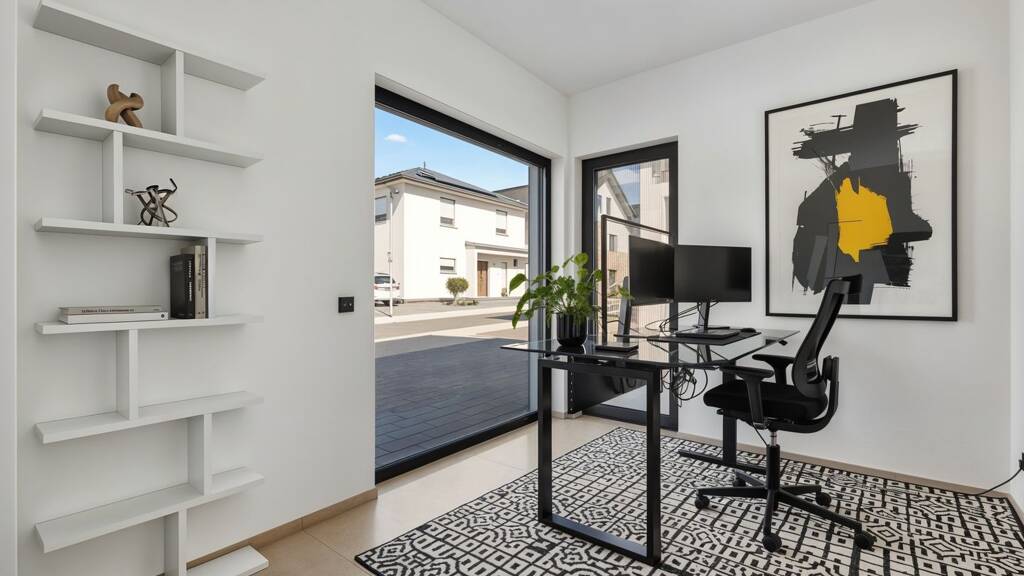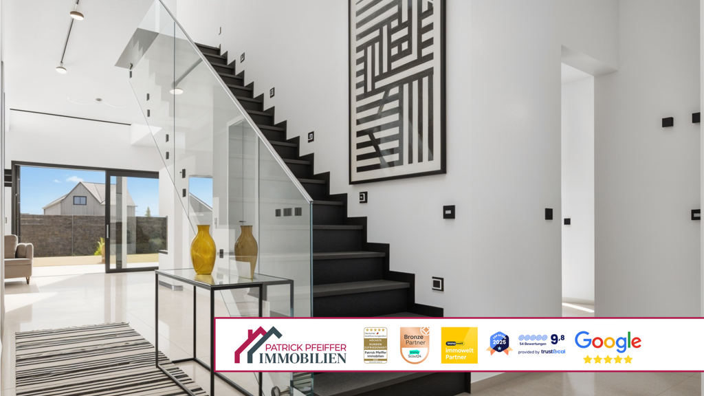 Schon beim Betreten des Hauses spüren Sie die Offenheit und Eleganz: Ein weitläufiger Eingangsbereich empfängt Sie mit hohen Decken, einem modernen Glasgeländer an der Treppe und edlen Fliesenböden. Großzügige Fensterfronten durchfluten die Räume mit Tageslicht und erzeugen ein harmonisches, warmes Ambiente. Hier möchte man ankommen, den Alltag hinter sich lassen und die Familie um sich versammeln.