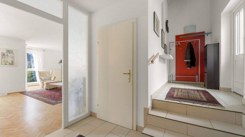 Die Liegenschaft bietet rund 158 m² Wohnfläche und überzeugt durch einen durchdachten Grundriss, der dem Haus Charakter und Großzügigkeit verleiht. Über den Windfang im Erdgeschoss gelangt man über wenige Stufen in den Flur, von wo aus man das WC sowie die Küche erreicht und weiter in den offen gestalteten Wohn-Essbereich gelangt. Große Fensterflächen schaffen eine helle, freundliche Atmosphäre und eröffnen einen schönen Ausblick, der bis zur Kirche St. Veit und die dahinterliegende Bergwelt reicht. Die vorgelagerte Terrasse erweitert den Wohnraum ins Freie und führt in den etwa 80 m² großen Garten, der ausreichend Platz für Erholung, Spielen oder gesellige Stunden im Grünen bietet.