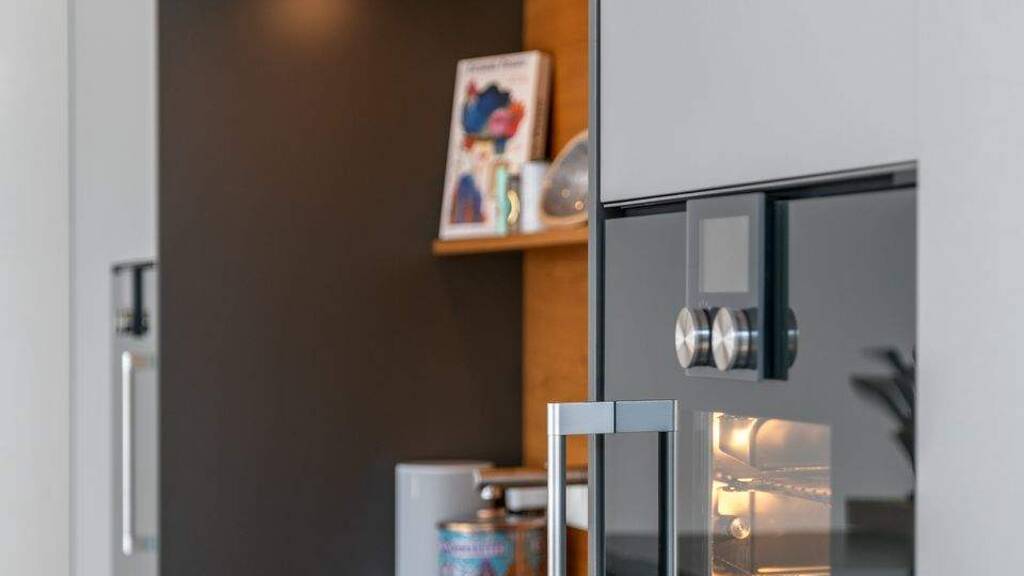 - Schreiner-Einbauküche (Beer Küchenmanufaktur) mit hellgrauen Fronten, Naturstein-Arbeitsflächen (Nero Assoluto, geledert) und Kochinsel einschl. Esstheke, ausgestattet mit breitem Ceran-Kochfeld einschl. Muldenabzug (Bora) und Steckdosen, Backofen, Dampfgarer, Wärmeschublage (alles Gaggenau), großem Kühlschrank, separatem Tiefkühler, Geschirrspüler (alles Miele), Edelstahl-Spülbecken, Geräte-Tablar und aufwändigem, exzellent geplantem Innenleben