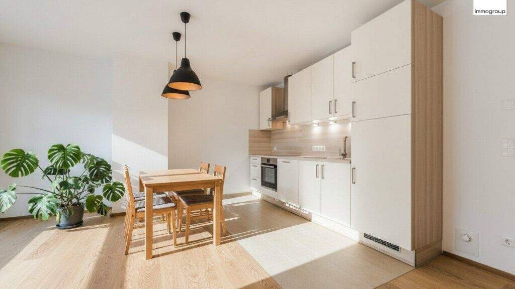 Große Fensterflächen sorgen für lichtdurchflutete Räume und ein angenehmes Wohngefühl. Der offen gestaltete Wohn-/Essbereich wird durch eine moderne Einbauküche in hoher Qualität stilvoll ergänzt - funktional, zeitlos und bestens ausgestattet.