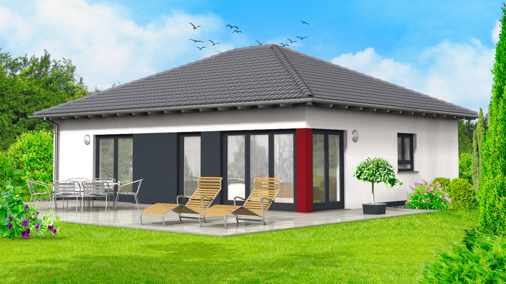 Dieser moderne Bungalow mit einer Wohnfläche von ca. 85 m² bietet eine durchdachte Raumaufteilung für maximalen Wohnkomfort. Der großzügige Wohn- und Essbereich ist offen gestaltet und bietet dank bodentiefer Fenster viel Tageslicht sowie einen direkten Zugang zur Terrasse.