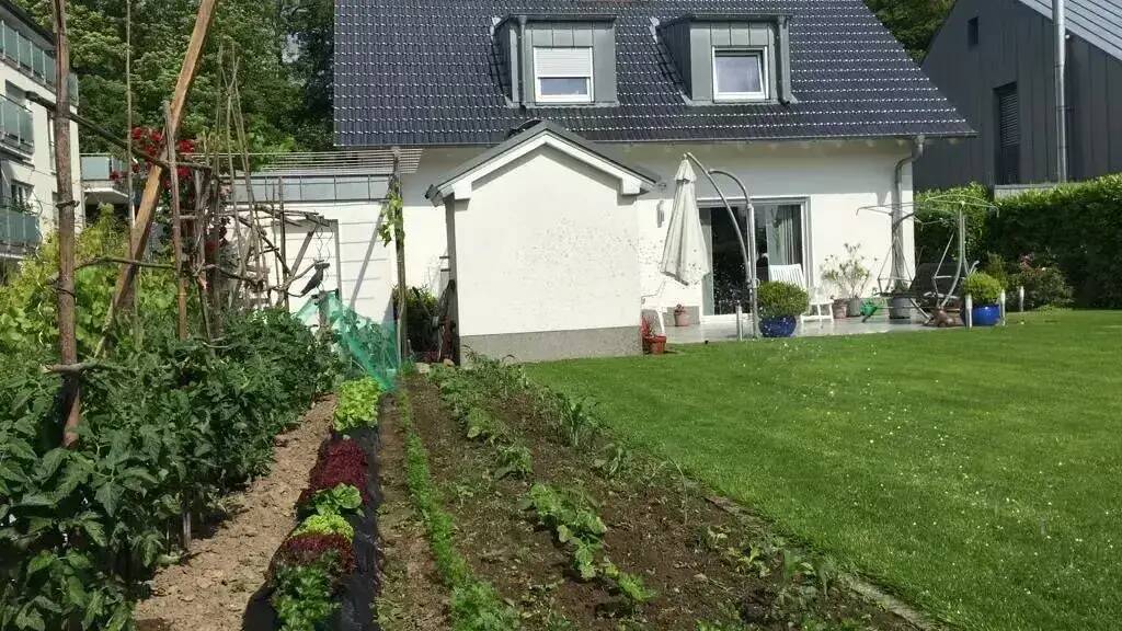 Der Außenbereich besticht durch einen liebevoll angelegten Garten mit automatischer Bewässerungsanlage, einem großzügigen Grillkamin, einem Gemüsebeet mit Weinreben sowie einem gepflegten Blumenbeet. Hier genießen Sie Ruhe und Erholung im eigenen Grünen.