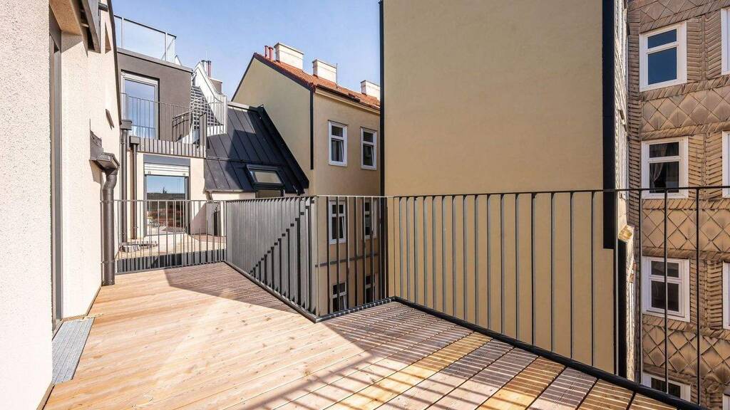 Beeindruckende "Über-Eck" ausgeführte Dachflächenfenster sorgen für einen ungetrübten Blick in den Himmel und bringen tagsüber die Zimmer zum Strahlen. Vom großen, lichtdurchfluteten Wohlfühl-Wohnzimmer geht es hinaus auf die südseitige Loggia. Von beiden zentral begehbaren (Schlaf-) Zimmern haben Sie Zugang zum XL-Balkon in Innenhofruhelage mit ca. 10,5 m² Fläche.