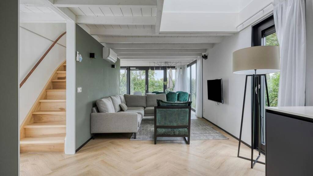 Das helle und geräumige Wohnzimmer ist das Herz des Hauses und bietet dank seiner Lage am Rande des Parks eine Oase der Ruhe. Große Fenster, ein Oberlicht und Flügeltüren sorgen für viel natürliches Licht und eine nahtlose Verbindung nach draußen. Die moderne, offene Küche schließt perfekt an das Wohnzimmer an und macht den Raum einladend und praktisch zugleich. Der PVC-Bodenbelag im Fischgrätmuster verleiht ein luxuriöses und warmes Gefühl, während die offene Raumaufteilung ein Gefühl von Raum und Freiheit vermittelt.