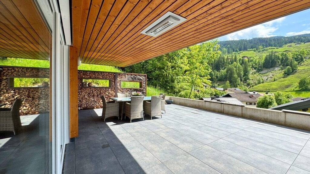 Ein besonderes Highlight bildet die rund 68 m² große, teilweise überdachte Terrasse in sonniger Südwest-Ausrichtung. Der integrierte Infrarotheizkörper ermöglicht auch in den Wintermonaten stimmungsvolle Stunden im Freien - bei einem Glas Glühwein und mit exklusivem Blick auf die verschneite Berglandschaft.