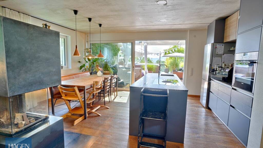 Im Inneren dominiert ein offenes Wohnkonzept, das durch raumhohe Verglasungen mit Licht durchflutet wird. Der Wohn- und Essbereich besticht durch großzügige Dimensionen, warmes Eichenholz, sichtbaren Beton und den stilprägenden Schwedenofen als zentrales Element. Die Materialien schaffen eine Atmosphäre von moderner Klarheit und behaglicher Wärme.
