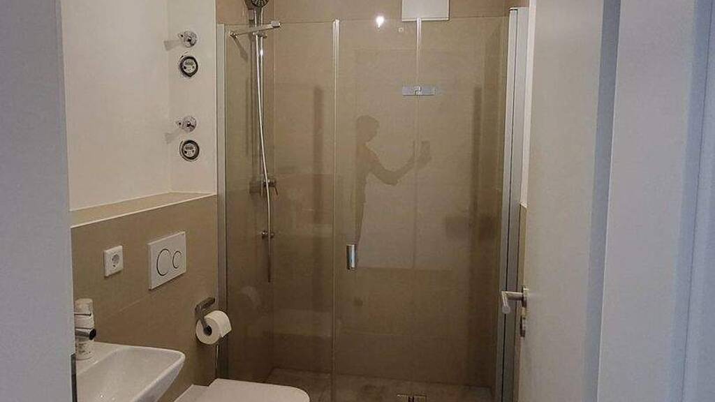 Das luxuriöse Tageslichtbad verfügt über eine Badewanne sowie einen Waschmaschinenanschluss und ist hochwertig gestaltet. Zusätzlich steht ein separates Gäste-WC mit Dusche zur Verfügung - ideal für Familien oder Gäste.