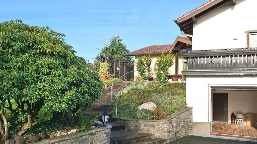 Die in den 60er Jahren erbaute Immobilie wurde in leichter Hanglage massiv errichtet. Im Unterge-schoss/Souterrain befindet sich eine große Doppelgarage, die Kellerbereiche, sowie eine kleine, sep. zugängige, Einliegerwohnung mit ca. 63 m² auf 2 Zimmer, Küche und Bad verteilt.