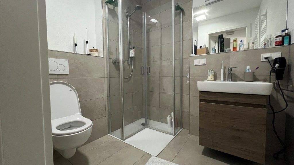 Ein modernes Badezimmer mit ebenerdiger Dusche, einem Waschbecken und einer Toilette komplettiert das Wohlfühlambiente dieser charmanten Wohnung. Schlichte Bodenfliesen schmeicheln der Modernität dieses Apartments.