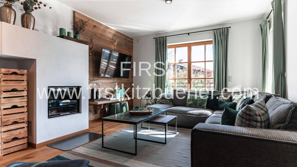 Die stilvoll möblierte Gartenwohnung betreten Sie auf der oberen Etage, die einen Wohnbereich mit Kamin und offener Küche und einen wunderbaren Blick auf das Kitzbühler Horn bietet. Die große Terrasse gibt zusätzlich den Blick auf den Wilden Kaiser frei und lädt entweder am großen Tisch mit Profigriller zu einer geselligen Runde mit Familie und Freunden ein oder Sie genießen in den gemütlichen Loungemöbeln an der Feuerstelle die Abendsonne. Ein Schlafzimmer und WC mit Dusche befinden sich ebenfalls auf dieser Ebene.