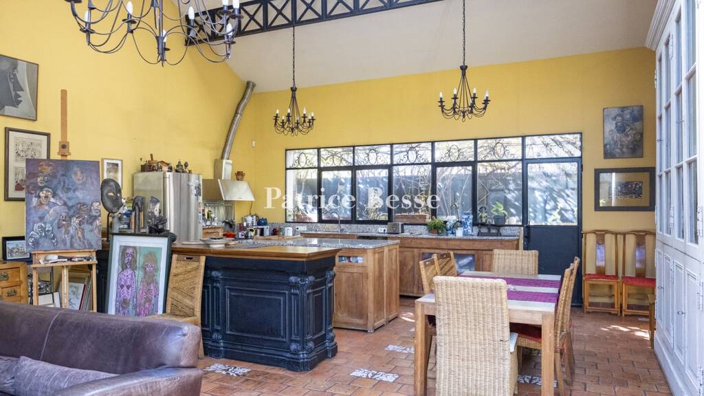 The ground floor includes an entrance hall with a cement tile floor, two large bedrooms, including one with its own bathroom and direct access to the garden, as well as a separate lavatory. A wooden staircase leads to the first floor with straight-plank oak hardwood floors, where the landing provides access to three bedrooms, a bathroom and lavatory. To the right of the entrance hall, the second section of the house is made up of a vast room of approximately 76 m² with a cathedral ceiling, the height of which culminates at 7 metres. This room, with a terracotta tile floor, includes a kitchen, dining room and living room with a fireplace.