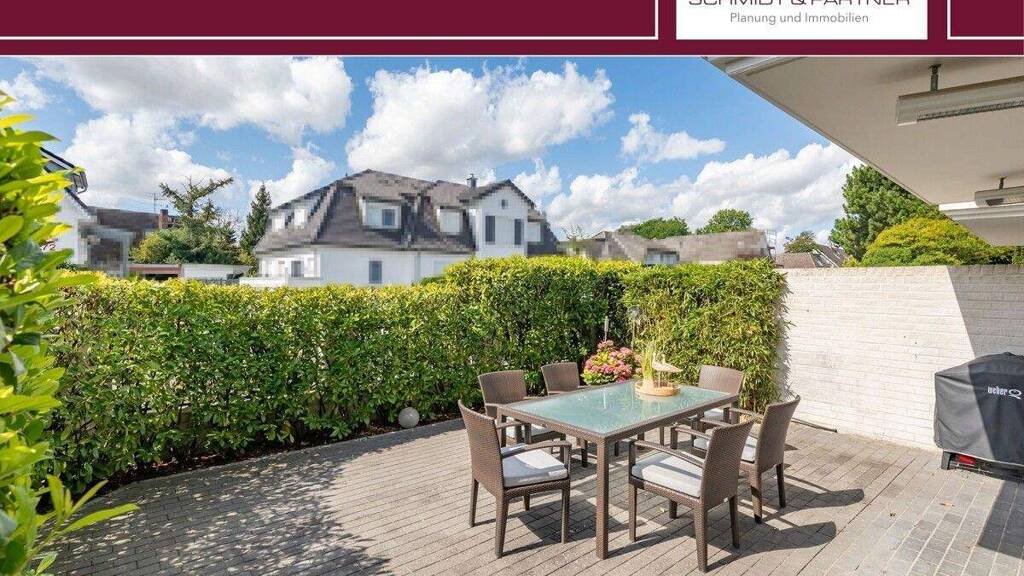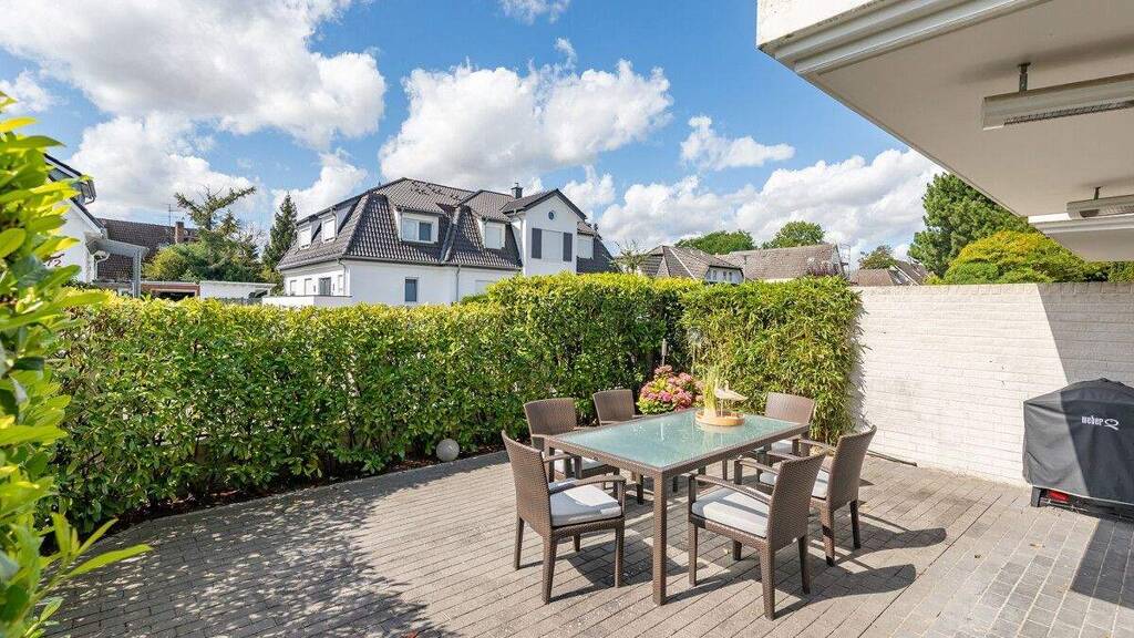 Diese elegante, hervorragend geschnittene 3-Zimmer-Wohnung befindet sich im Erdgeschoss eines großzügigen Doppelhauses. Die Einfahrt sowie die Doppelgarage teilen Sie sich nur mit einer weiteren Einheit, wodurch Ihnen besondere Ruhe und ein hohes Maß an Privatsphäre geboten werden.