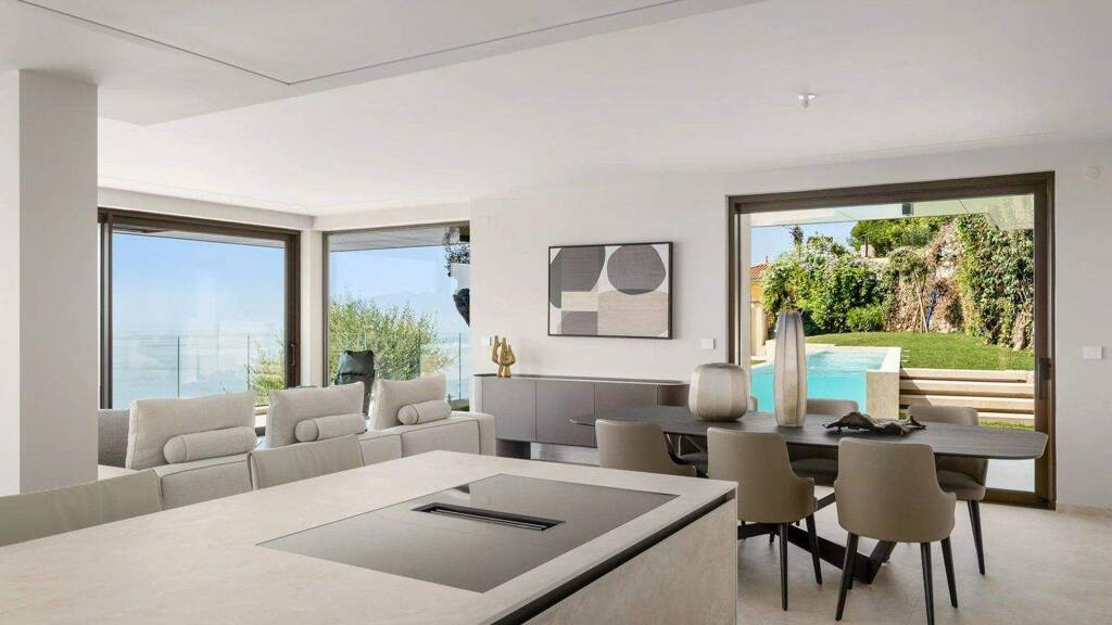 The south-facing villa boasts panoramic sea views from all main rooms on each level of the house. The large bay windows open onto a vast, light-filled double living room of 80 m2. The villa consists of a fully equipped American kitchen with high-end appliances, 5 bedrooms, including two master suites.