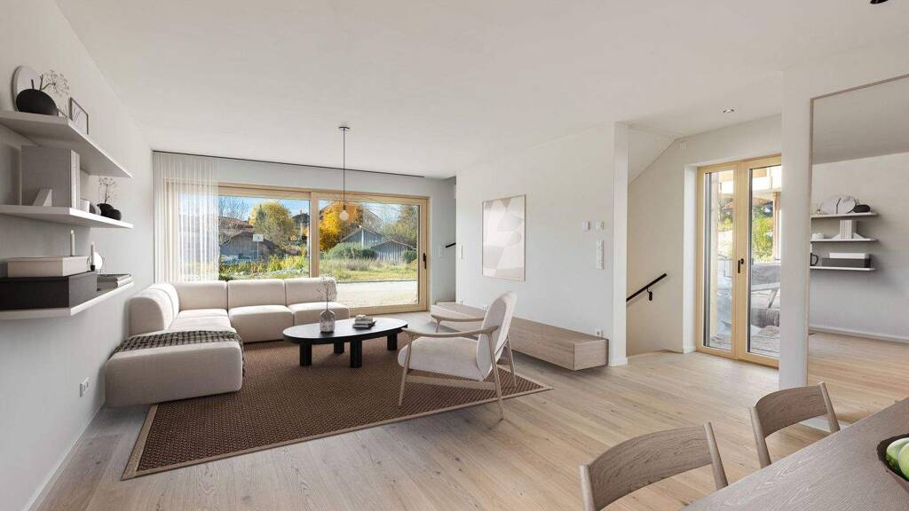 Die Innengestaltung wird von Stilempfinden und Wertigkeit geprägt. Geöltes Eichenparkett mit Fußbodenheizung, zeitlose Badgestaltung und elektrische Rollläden schaffen ein ebenso attraktives wie einladendes Wohnumfeld. Durch große Glasfronten wird die malerische Umgebung zu einem unverzichtbaren Teil des Wohnens. Für eine nachhaltige Beheizung sorgt eine Luft-/Wasser-Wärmepumpe, die durch eine Solaranlage unterstützt wird.