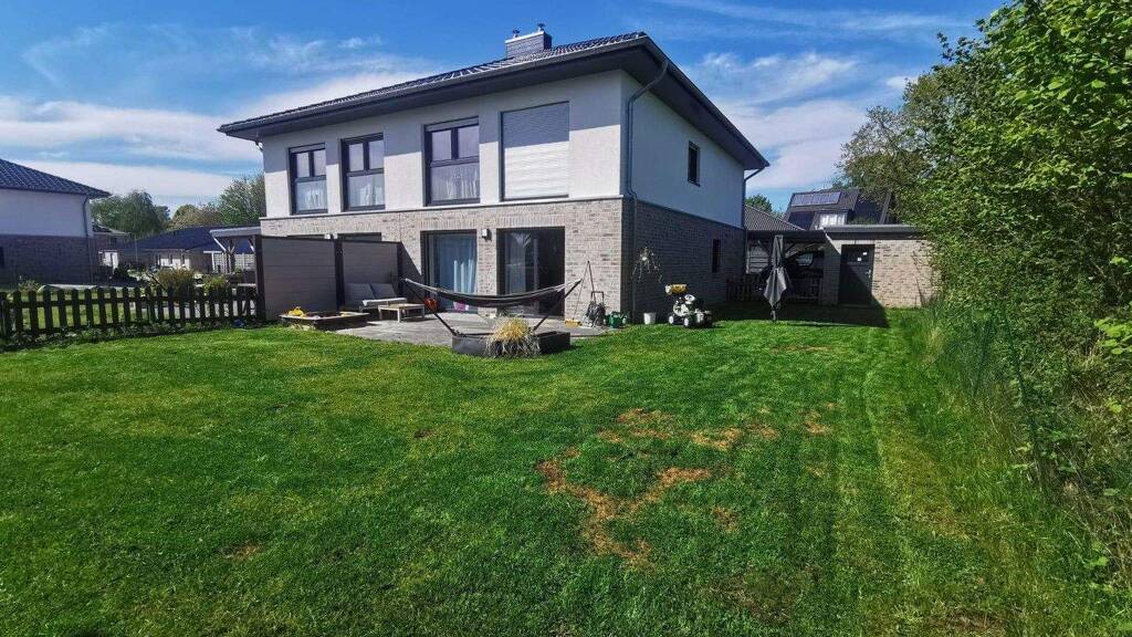 Groß-Quern Steinbergkirche, ein idyllischer Ort, der eine gute Infrastruktur, Natur und Geschichte vereint. Diese Doppelhaushälfte aus dem Jahr 2022 verfügt über eine effiziente Luftwärmepumpe, und einen Schornstein als Vorbereitung für einen gemütlichen Kamin.