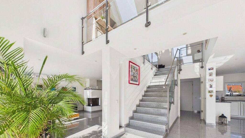 Bereits beim Betreten des Hauses eröffnet sich ein beeindruckender Eingangsbereich mit einer offenen Galerie, die zweifellos das architektonische Herzstück der Immobilie bildet. Sie verbindet die Ebenen auf elegante Weise, schafft großzügige Sichtachsen und verleiht dem Haus ein besonders luftiges und repräsentatives Raumgefühl.