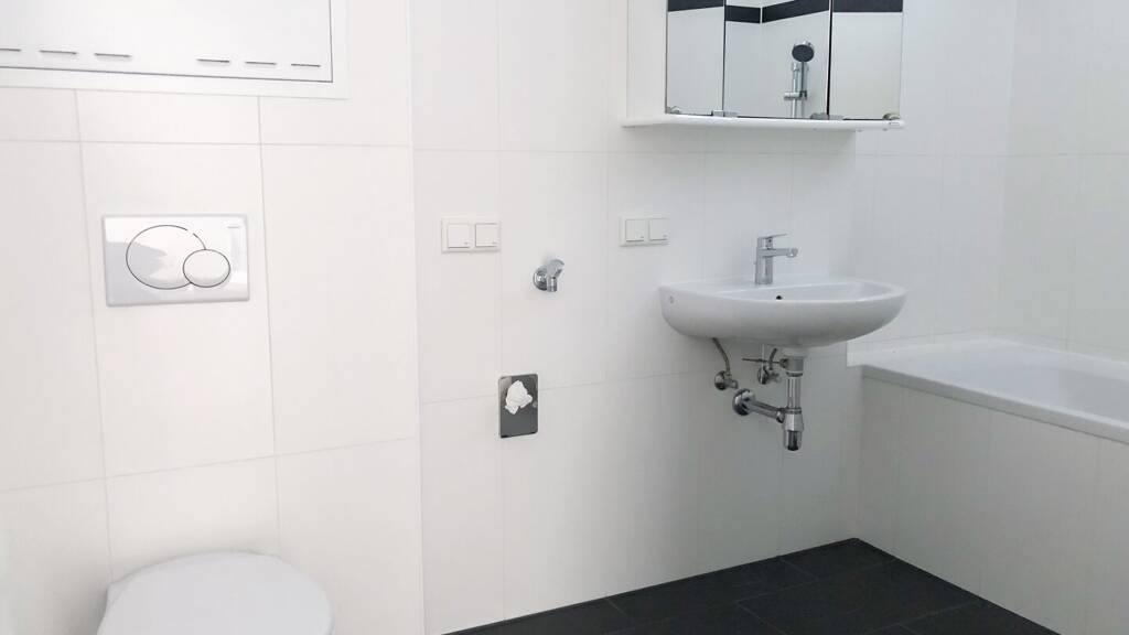 - Badezimmer mit Badewanne, WC und Waschmaschinenanschluss