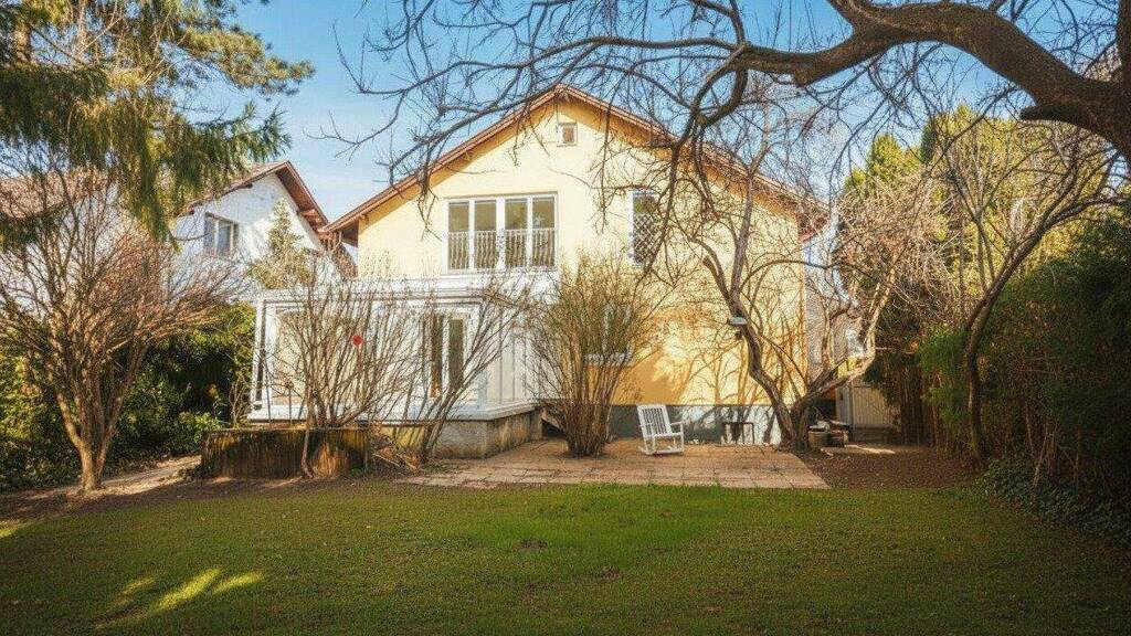 Der ruhige, südseitige Garten verfügt über eine ebene Rasenfläche mit einigem Altbaumbestand und einen Grundwasserbrunnen, der zur Gartenbewässerung verwendet wird. Als Nebengebäude gibt es noch eine straßenseitige Garage.