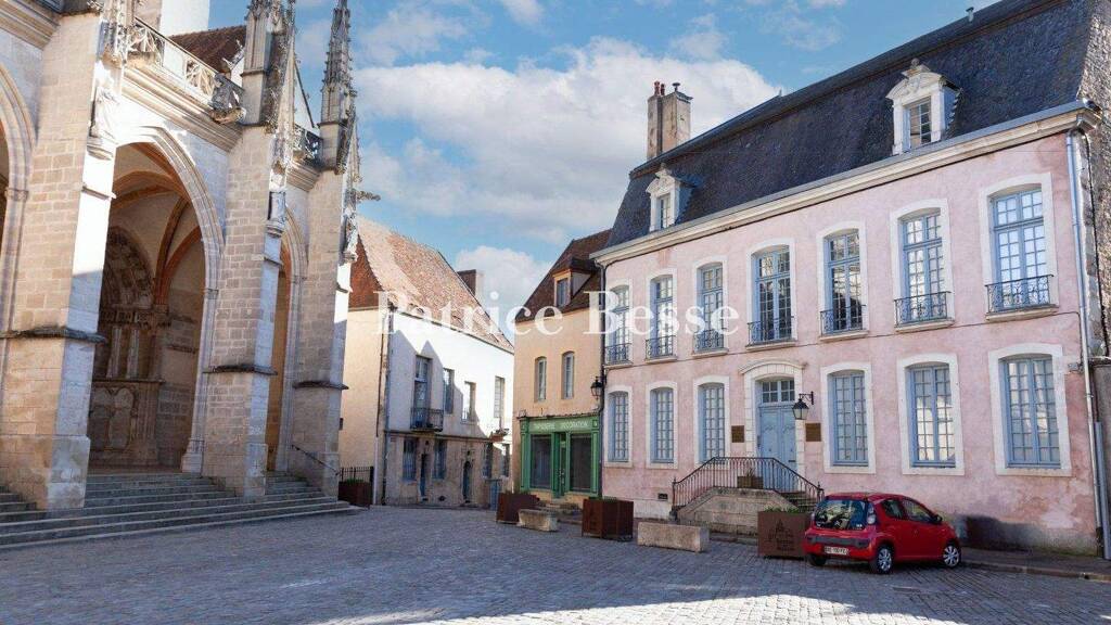 Situated in the historic centre of Semur, opposite the Collegiate Church of Notre-Dame, the foundations of which date back to the 11th century, the residence dominates a cobbled square surrounded by timber-framed buildings, townhouses and numerous shops within walking distance. The townhouse has a classic, sober architectural style and faces north-east/south-west. Its front facade is harmoniously punctuated by fourteen windows arranged in seven bays. The slate mansard-style gambrel roof has two dormer windows, each crowned with an arched pediment featuring a high-relief male or female head. This is how those who may have been the residence's first inhabitants now watch over it. A double flight of approach stairs leads up to the main door. The sober doorway features a simple rusticated surround topped by an eyebrow lintel. This is the only entrance to the building on the street side.