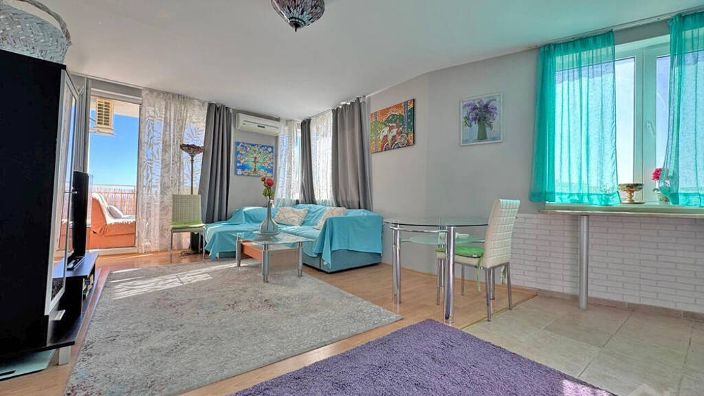 Zum Verkauf steht ein Apartment mit 2 Schlafzimmern und Meerblick im Komplex "Imperial Fort" in Sveti Vlas. Das Apartment befindet sich im 3. Stock und hat eine Fläche von 85 m². Es besteht aus einem Flur, einem Wohnzimmer mit Küche, zwei Schlafzimmern, zwei Badezimmern und zwei Terrassen.